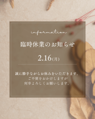 誠に勝手ながら2/16(月)お休みをいただきます。 ご不便をおかけしますが、何卒よろしくお願いいたします。